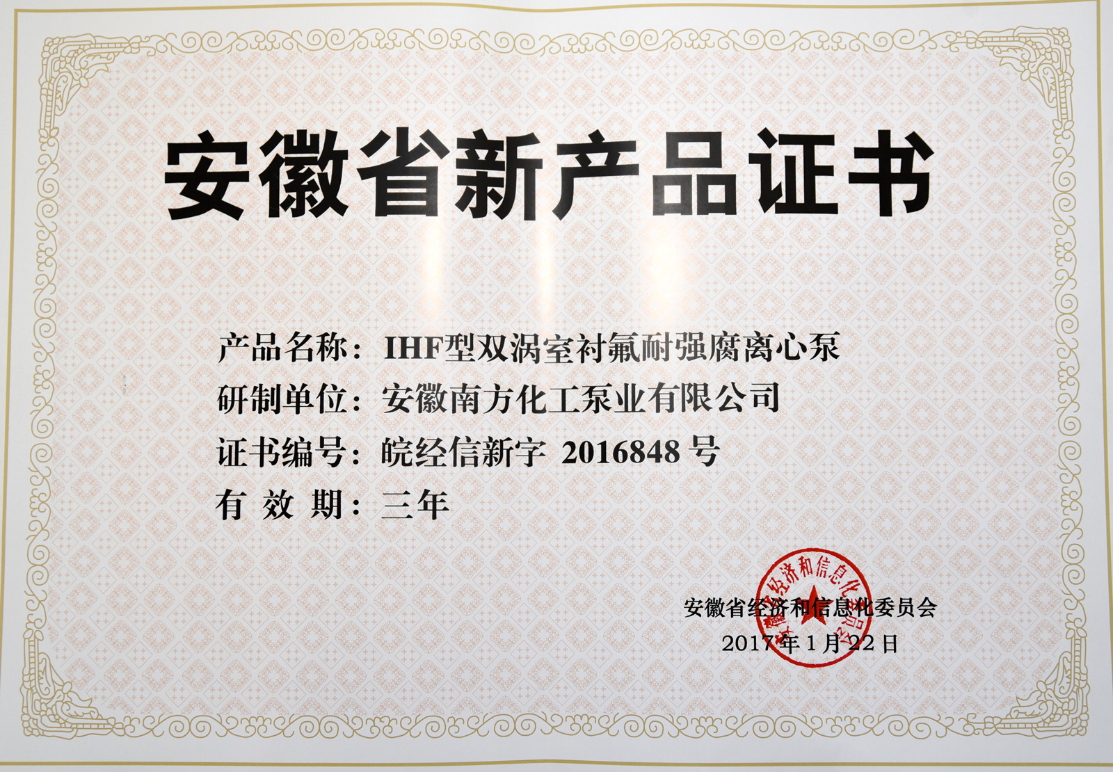 2017年,我公司又新添兩項新產(chǎn)品發(fā)明認證,此證書是獲得由安徽省經(jīng)濟和信息化委員會頒發(fā)的《安徽省新產(chǎn)品證書》,該證書的取得標志著安徽南方化工泵業(yè)持續(xù)多年對產(chǎn)品研發(fā)和設(shè)計投入大量人力物力的一個肯定,同時也標志著安徽南方化工泵業(yè)的研發(fā)實力又邁進了一個新臺階,為“南方牌”氟塑料系列泵、不銹鋼系列泵起到推動作用。